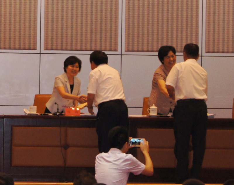 10日下午,郑院长参加了在福建会堂召开的庆祝第30个教师节暨全省教育系统先进集体和先进个人表彰大会。省领导陈桦、李红、陈绍军、薛卫民出席大会。李红主持会议。陈桦做了重要讲话。会议表彰了2014年福建省特级教师、优秀教师、先进教育工作者和教育教学成果奖,并为老教师志愿支教团成员颁发荣誉证书。我院院长郑郁善、副院长刘文开等人完成的“基于福建生态省建设的林业类高职人才培养体系构建与实践”教学成果荣获2014年福建省高等职业教育教学成果特等奖。省领导陈桦向郑郁善院长颁发了获奖证书。(院办)