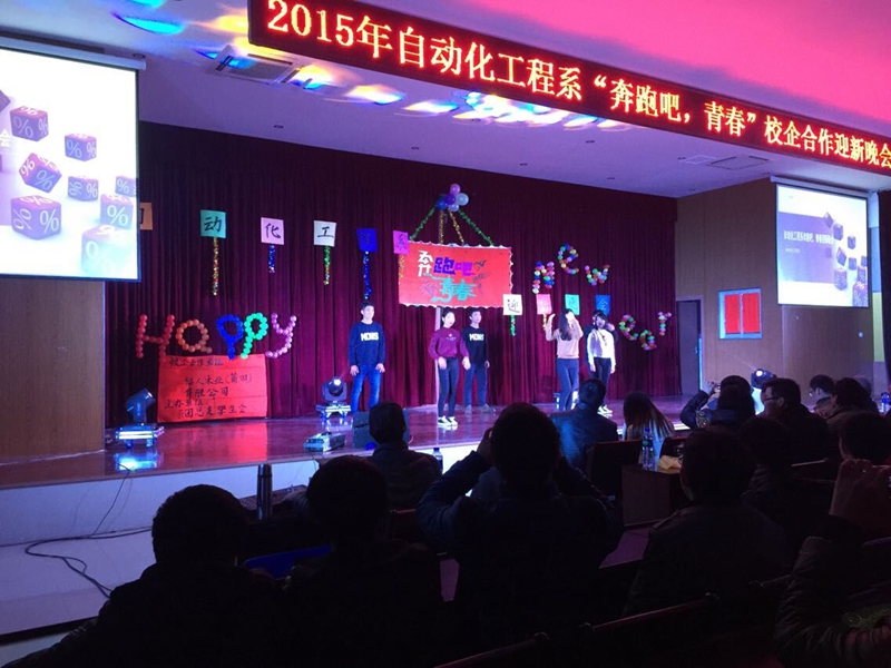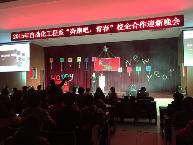 本网讯 2014年12月29号晚上七点30分,在学院江南校区报告厅自动化工程系举办了“奔跑吧,青春”校企合作迎新晚会。学院纪委书记章志勇、自动化工程系全系教师及自动化工程系13、14级全体同学观看了晚会。