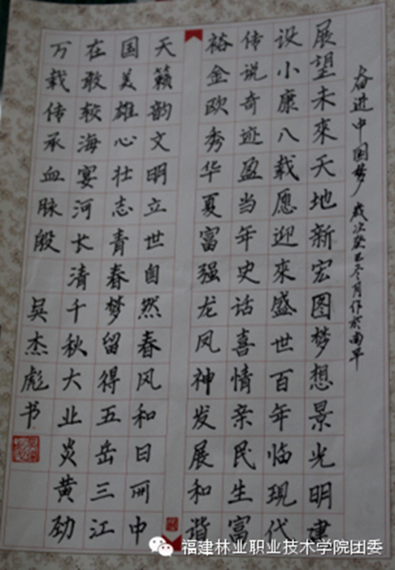 2014年4月,院团委积极做好第四届大学生艺术节作品选拔、推荐工作,共收到艺术类作品374份:其中绘画类162幅;书法类103幅;摄影类86组;设计类20份;微电影类2部;篆刻类1枚。经过团委老师的认真指导,最终,朗诵作品《与妻书》、小品《车站》获全省第四届大学生艺术节艺术表演类节目三等奖,合唱《小纸船的梦》、《我们走进十月的阳光》荣获全省第四届大学生艺术节合唱节目三等奖,周曦同学的书法作品《中国梦,中国情》、吴杰彪同学的书法作品《奋进中国梦》、《我与中国梦》分获全省第四届大学生艺术节艺术作品三等奖和优秀奖。