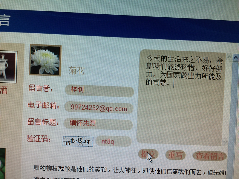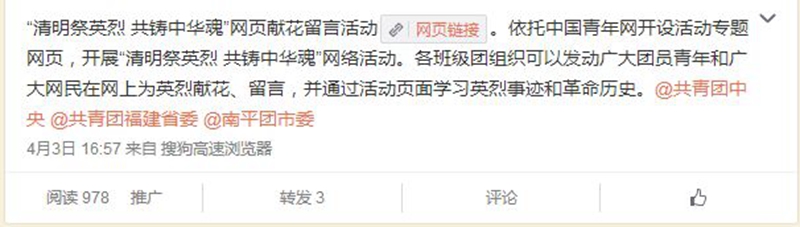 学院团委号召学院广大团员青年们积极参加团中央线上“清明祭英烈·共铸中华魂”网页献花留言活动,为英烈献花、留言,通过活动页面学习英烈事迹和革命历史;在新浪、腾讯微博和微信公众平台发起#清明祭英烈#话题讨论活动,留言写下对英烈的缅怀和敬仰,对话题微博转发、评论、点赞,参与人数达到4000多人次。