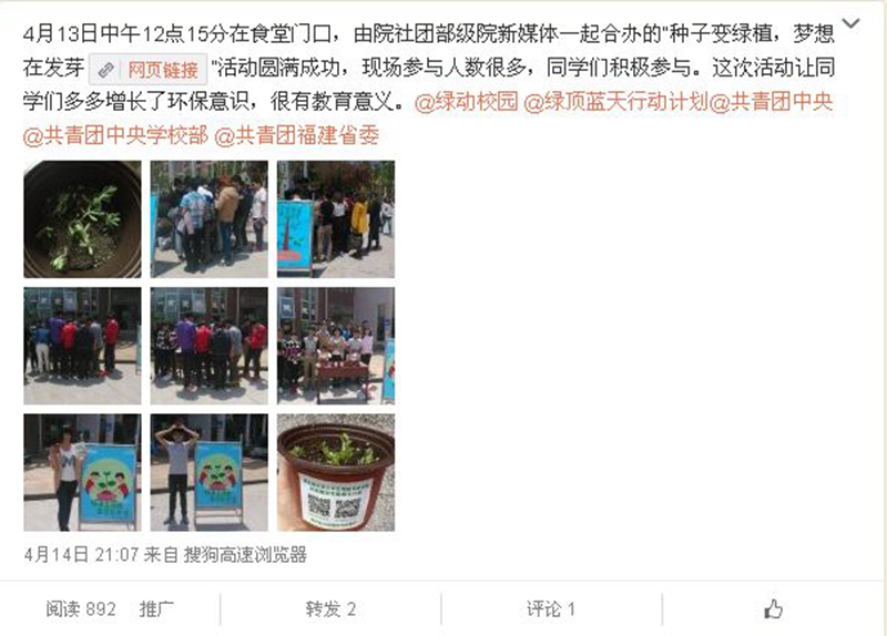 本网讯 为在广大青年学生中传递环保理念,引导大学生树立环保意识,积极参与环保实践,院团委于2015年4月13日至20日,积极组织开展主题为“种子变绿植,梦想在发芽”的大学生“绿植领养”环保活动。按照福建团省委有关文件要求,结合学院实际情况,开展了线上、线下环保活动。