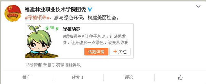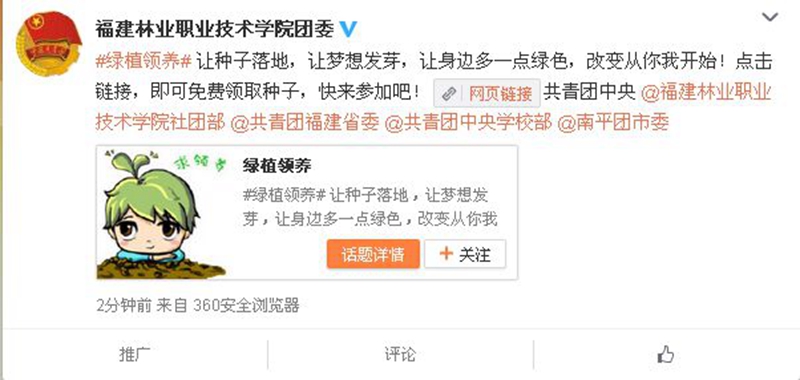 院团委积极组织学生会干部及绿色环保协会会员们在新浪微博上积极参与线上摇一摇预约领种子、发表环保宣言、环保公益募捐行动等活动,倡导学生们在活动官方页面进行话题讨论,线上发布自己的环保宣言,来唤醒网友的环保行动意识。