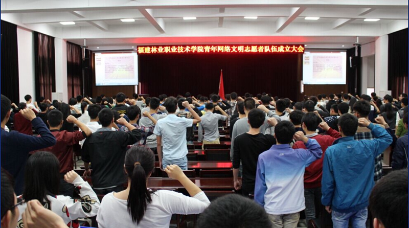 本网讯 为深入贯彻落实习近平总书记重要指示精神,动员和引领学院广大共青团员青年将先进性和担当精神延伸到网上,争当“中国好网民”,在网上积极发出“青年好声音”,在构建清朗网络空间中努力发挥主力军作用。4月21日下午4时,学院团委在江南校区礼堂隆重举行福建林业职业技术学院青年网络文明志愿者队伍成立大会,共青团南平市委专职团干,院系团工作负责人及网宣工作学生骨干约300人出席大会。