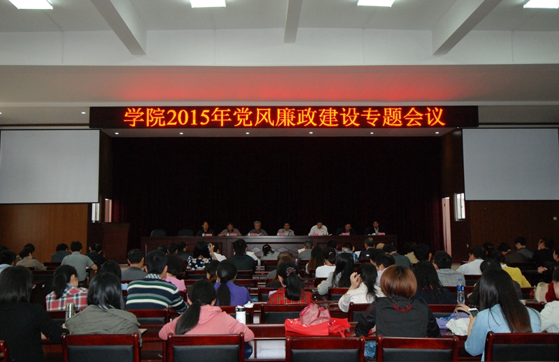 本网讯 4月28日,学院在江南校区召开2015年党风廉政建设专题会议,全体党员及副科级以上干部参加了会议,会议由院长郑郁善主持。
