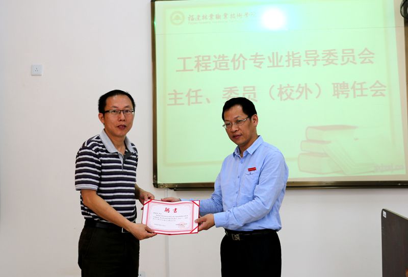 本网讯 为深化教学改革,扎实做好专业建设,实现专业与行业、企业的对接。2015年5月9日上午,交通工程系在实训一号楼会议室召开了工程造价专业专业指导委员会主任和委员(校外)的聘任会。本次聘任的专业指导委员会主任(校外)为福建省造价总站的教授级高工高雄映同志,聘任的委员(校外)为南平市造价协会的高级工程师黄敬民同志。本次聘任的目的是希望我院工程造价专业的专业建设在两位行业专家的指导下,在专业调研、人才培养方案修订、课程体系建设、师资队伍培养等方面全面与行业企业接轨。