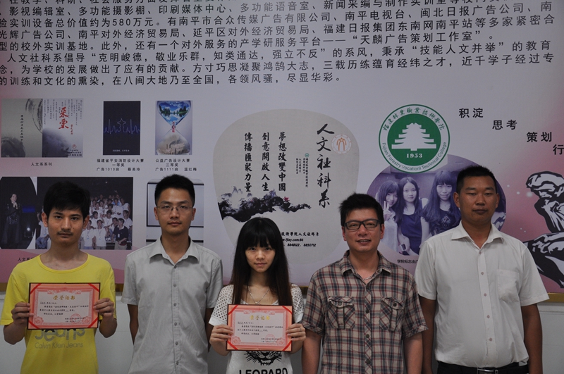 5月13日,由南平发展集团全资子公司福建大武夷电子商务有限公司主办的2015“清新福建·生态南平”“红袍娃”形象设计和旅游商品设计大赛落下帷幕,在来自全国各地的近千幅作品中,广告设计与制作1315班的吴伟坚获得“红袍娃”形象设计大赛三等奖,广告设计与制作1315班曾婷婷、韩杰彬分别获得旅游商品设计大赛二、三等奖。为了尽快将设计作品推广应用,双方签署了知识产权转让协议。为此,吴伟坚、曾婷婷、韩杰彬分别获得了1000元、1000元和500元的转让费。
