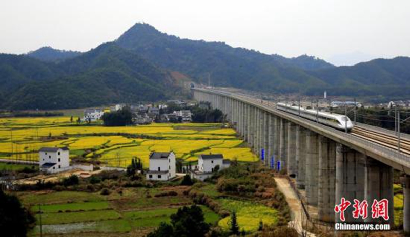 6月28日,合福高铁开通运行。合福高铁自合肥南站引出,经安徽巢湖、铜陵、绩溪、黄山,江西婺源、上饶,福建武夷山、南平,至福州站,线路全长806公里;因经过武夷山、黄山、婺源等风景名胜区,被赞为“最美高铁”。姚云龙 摄 来源:中国新闻网