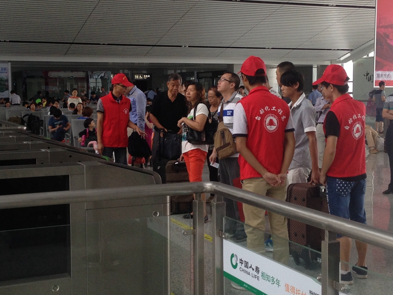 本网讯 为了丰富学生的课后活动,2015年9月19日,学院自动化工程系组织学生开展志愿者活动——服务高铁站。参加此次活动的人员分工明确,15人共设立5个服务点:检票口、进站口、出站口、安检、及售票大厅。从旅客到达北站至上车,我们的志愿者一路服务,为他们取票、答疑、提行李、引导等等。他们每一句感谢,都是对我们工作的认可。一位来自福州的旅客表示,看到林职院学生的表现,不仅仅体现了学生们的个人素质,更加体现了整个林职院的素质及文化。