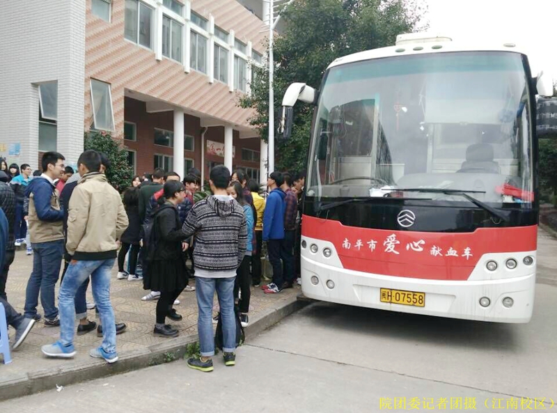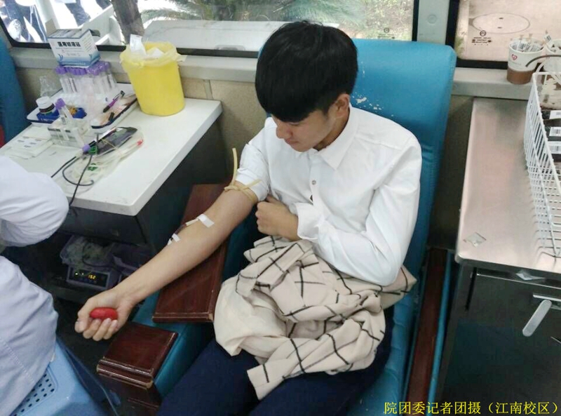 本网讯 为弘扬无私奉献的优良品质,传递正能量。2015年12月15日12时至18时,院团委在江南校区第一食堂门口开展了“奉献爱心,利人利己”无偿献血活动。
