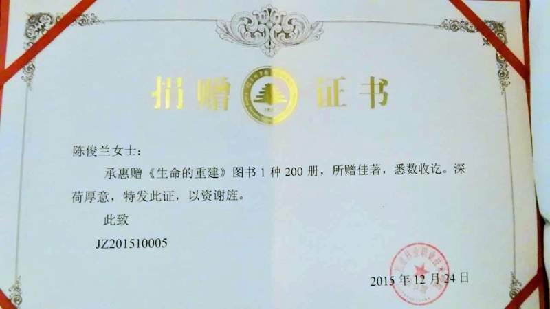 当她回到生活的正轨后,因着对母校的感情,对学弟学妹们的关心,希望每个学弟学妹们都能阅读《生命的重建》这本书,学会正确看待生活中的困难和挫折,活在“当下”,创造有意义的人生。