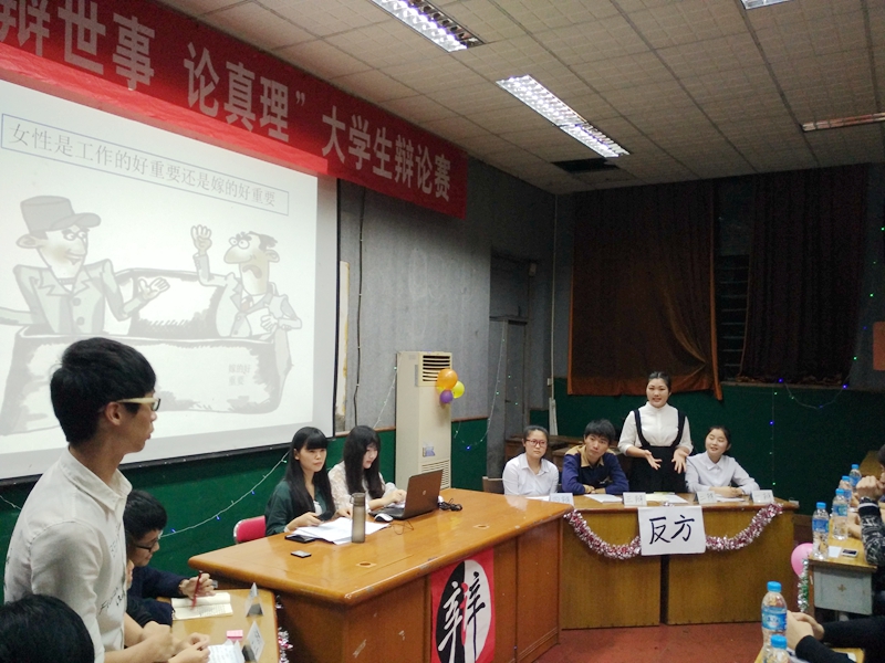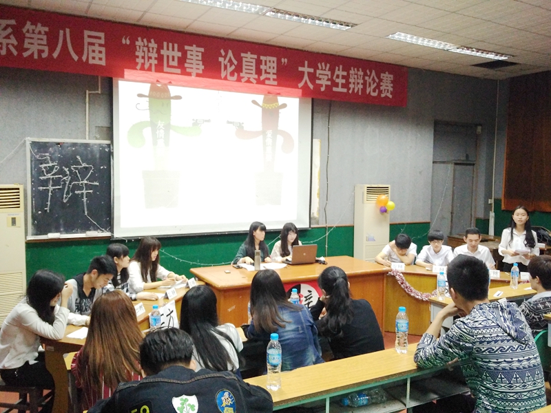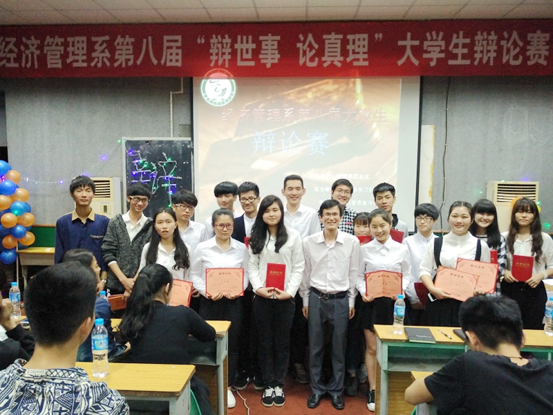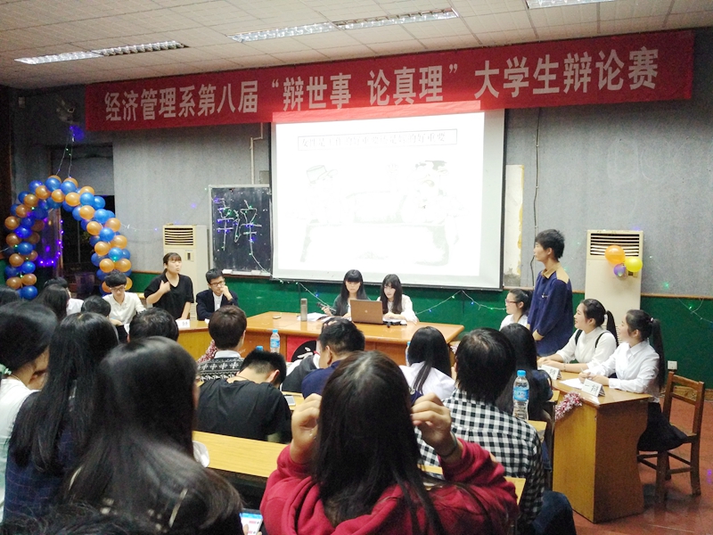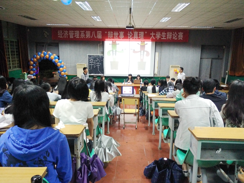 本网讯 2016年4月14日,经济管理系第八届“辩世事,论真理”校园辩论赛在天麟校区第一多媒体教室如期举办。经过一个月初赛、复赛的激烈角逐后,共有4队组合脱颖而出,进入辩论赛决赛。本次辩论赛旨在加强学风建设,促进各班学风交流,丰富同学课余生活,活跃校园气氛,开拓同学思路,体现大学生风华正茂的精神状态。
