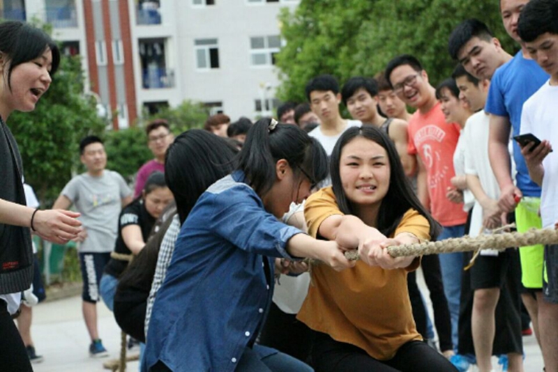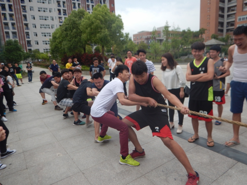 比赛前,运动员们的神经就像比赛的绳子一样,绷得紧紧的,旁边的啦啦队也精神抖擞。随着裁判哨子的吹响,运动员们突然发力,男生个个都涨得面红耳赤,青筋爆粗;女生也毫不示弱,放下了平时的淑女风范,使尽浑身力气,不顾一切地往后拉。各班啦啦队热情高涨,为自己班加油助威。加油声,呐喊声此起彼伏,震耳欲聋,飘荡在宿舍楼之间。同时也吸引了大量呆在宿舍的其他系的学生走出阳台或者走下来人工湖观看,甚至为队员欢呼。活动也吸引了不少老师前来加油助阵,比赛场面真可谓热闹非凡,相当震撼。
