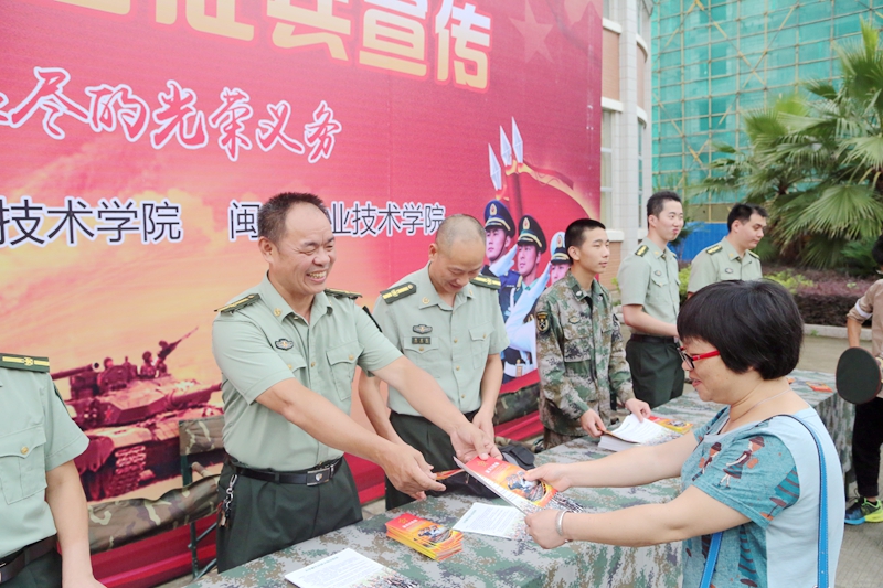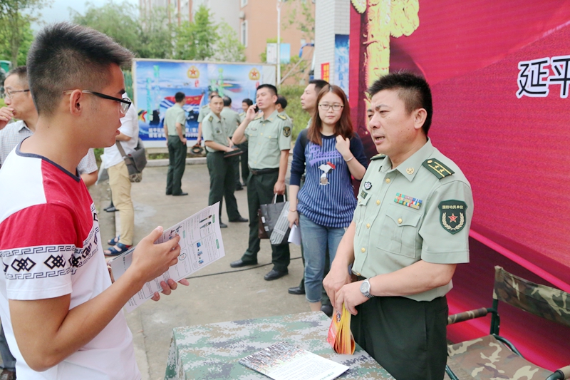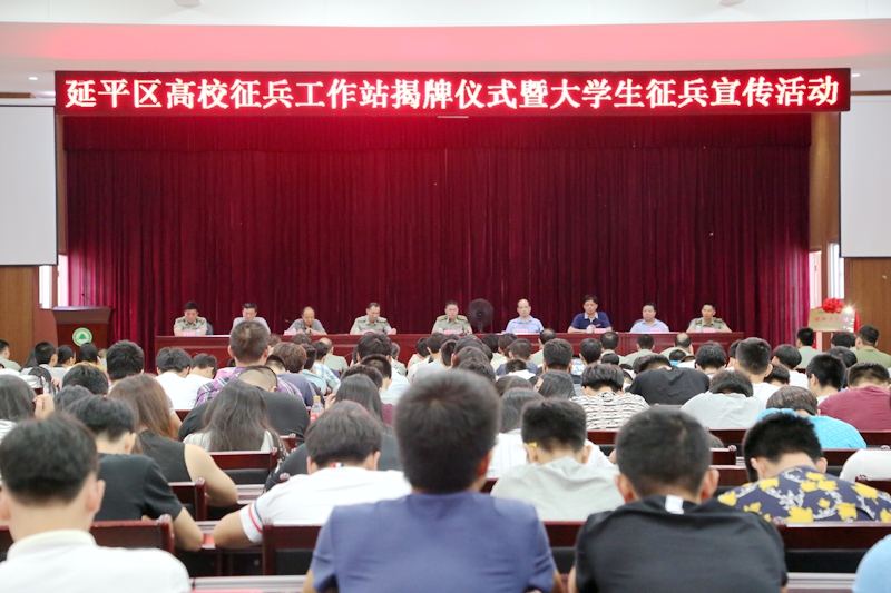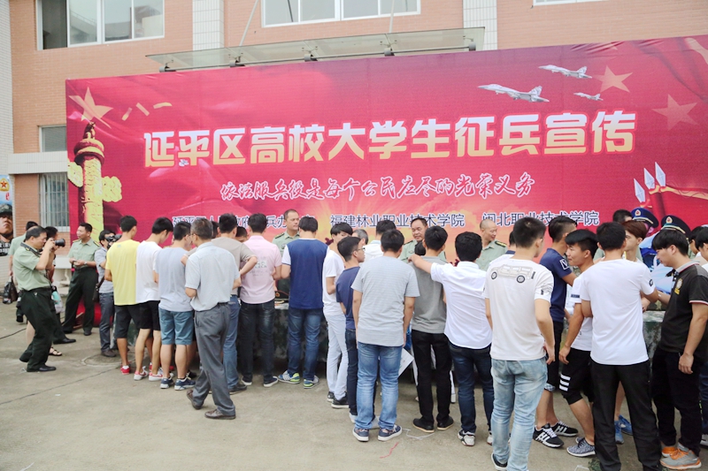 本网讯 为了贯彻全国、全省大学生征兵工作会议精神,广泛动员大学生应征入伍,进一步推动大学生征兵工作的落实,6月15日,2016年延平区高校征兵工作站揭牌仪式暨大学生征兵宣传活动在福建林业职业技术学院江南校区三食堂四楼礼堂举行。学院党委副书记陈洪尧、市征兵办主任、军分区参谋长周建新,延平区政府副区长胡庆雄,闽北职业技术学院党委副书记陶金辉,延平区教育副局长林进,延平区武装部副部长曾华忠,市征兵办动员科科长吴海涛,学生处副处长李霞等嘉宾出席仪式。会议由延平区武装部政委范智文主持。