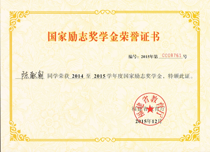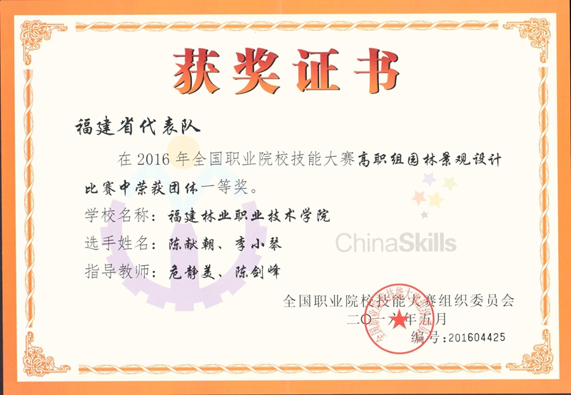 在学习上,他从未放松过对专业知识的学习,他始终以严谨、一丝不苟、大胆的态度对待每一门学科。入学以来,他不断巩固已学的知识,温故而知新。上课时,他积极配合任课老师,是发言最积极的一个;遇到难题,能自主钻研问题,虚心向老师求教,勇于尝试,勇于创新。皇天不负有心人,经过三年的努力他成为了班里的佼佼者,他曾多次获得国家励志奖学金、全国技能大赛园林景观设计一等奖、福建省技能大赛景观设计一等奖、学院奖学金、三好学生等荣誉。除了自己学习外,还帮助其他同学一起解决学习和生活上遇到的困难,争取与大家共同进步,在班级里起到了良好的带头作用。