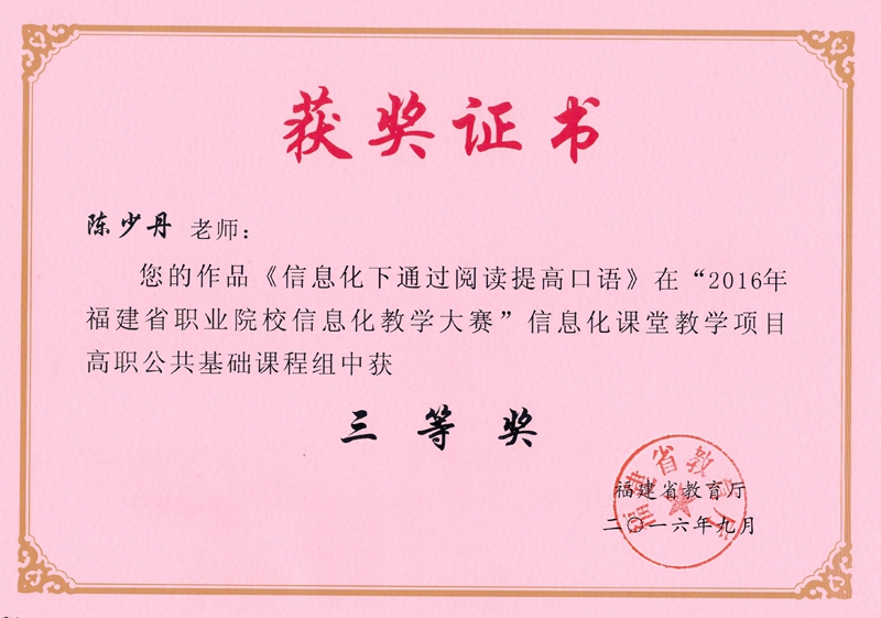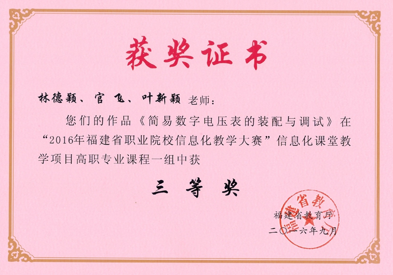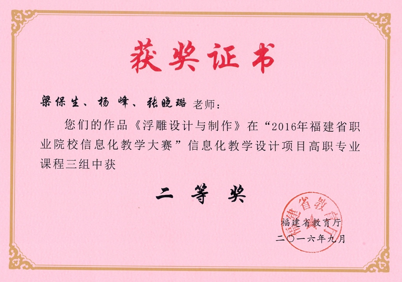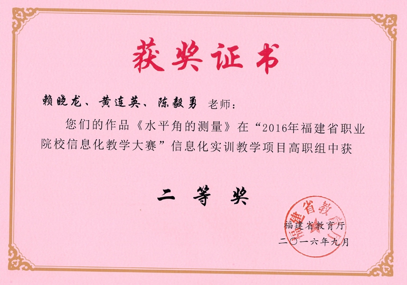 本网讯 根据《福建省教育厅关于举办2016年福建省职业院校信息化教学大赛的通知》(闽教职成〔2016〕51号)精神,学院举办了院系两级信息化教学比赛,进一步提高教师教育技术应用能力和信息化教学水平,选送了部分优秀作品参加全省职业院校信息化教学大赛并喜获佳绩,共获得二等奖2项,三等奖3项。具体获奖名单如下: