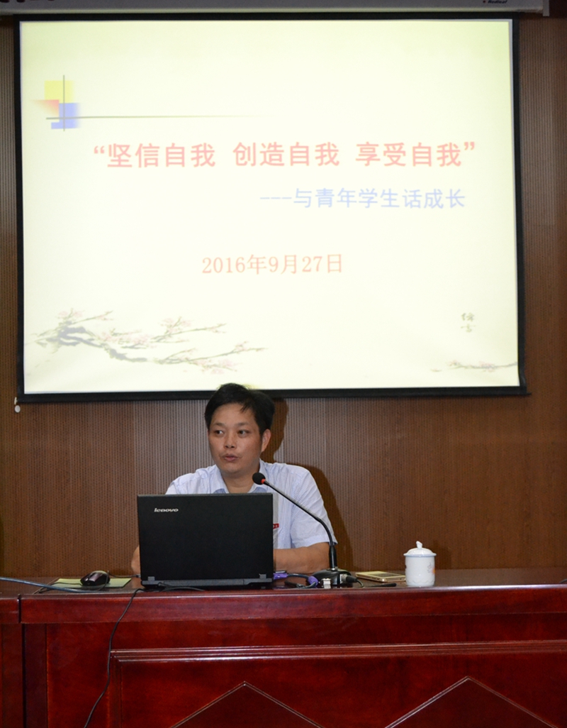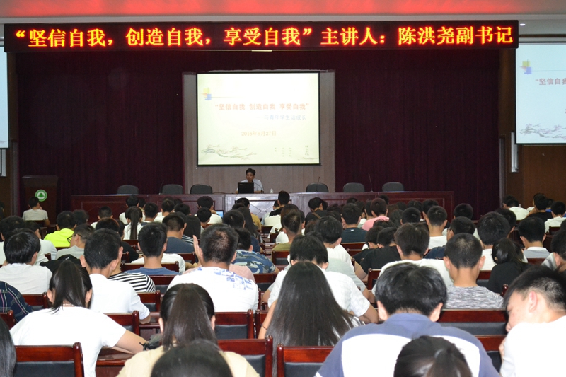 本网讯 为使2016级新同学能更好的适应大学新生活,树立人生目标,2016年9月27 日,党委副书记陈洪尧为林学系新生开设了题为“坚信自我 创造自我 享受自我”的专题讲座。讲座主要针对大一新生展开,目的在于让2016级新生接受大学教育的熏陶,更好规划自己三年的大学生涯,提高自身综合素质。