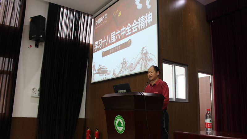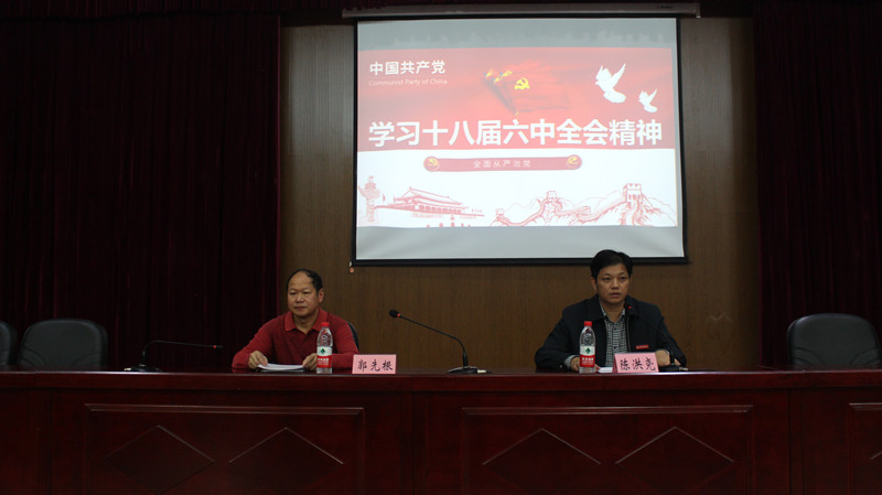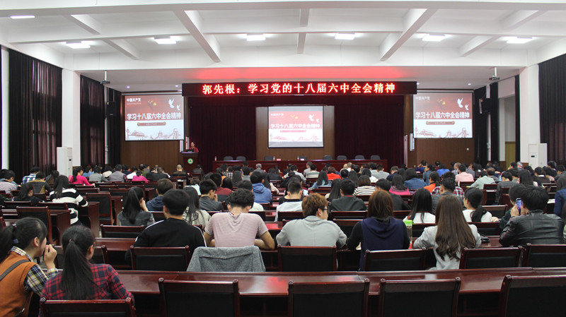 本网讯 为认真学习贯彻党的十八届六中全会精神,扎实推进“两学一做”学习教育深入开展,2016年11月15日下午,学院在江南校区礼堂召开了党委中心组(扩大)学习会,专题学习党的十八届六中全会精神。讲座由学院院长助理、学生处处长、思政部主任、党校副校长郭先根主讲,党委副书记陈洪尧主持,全体师生党员听取了讲座。