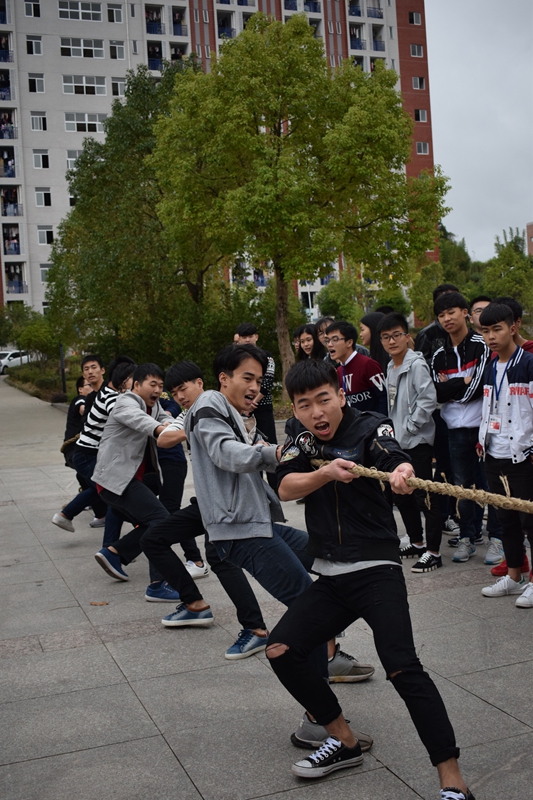 比赛分为男子组和女子组,实行淘汰制晋级方式,抽签分组级比赛首场站位。下午两点整,人工湖前人山人海,随着裁判哨声响起,男生们都涨得面红耳赤,口中高呼‘一二,一二’;女士们也毫不示弱,铆足了劲,不顾一切地往后拉。各班的拉拉队为本班队员加油,助威。加油声,呐喊声,此起彼伏,飘荡在整个赛场上空。