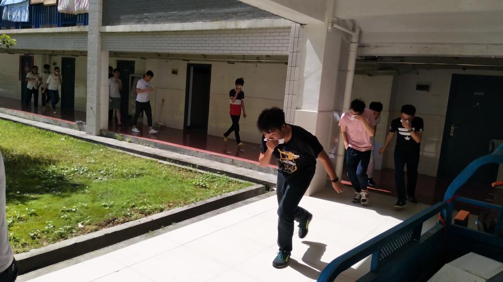 演习在一声哨令下有条不紊地开始了。总指挥发出疏散信号,随后各楼层立即分别安排吹哨员吹响哨声。同学们听到信号后保持冷静,用毛巾、袖头等捂住口鼻降低身体温度,按规定线路及时疏散,在规定时间内到达人工湖前集合。此次活动意义深远,整个逃生疏散过程紧凑有序,较好的达到了预期的演练效果。