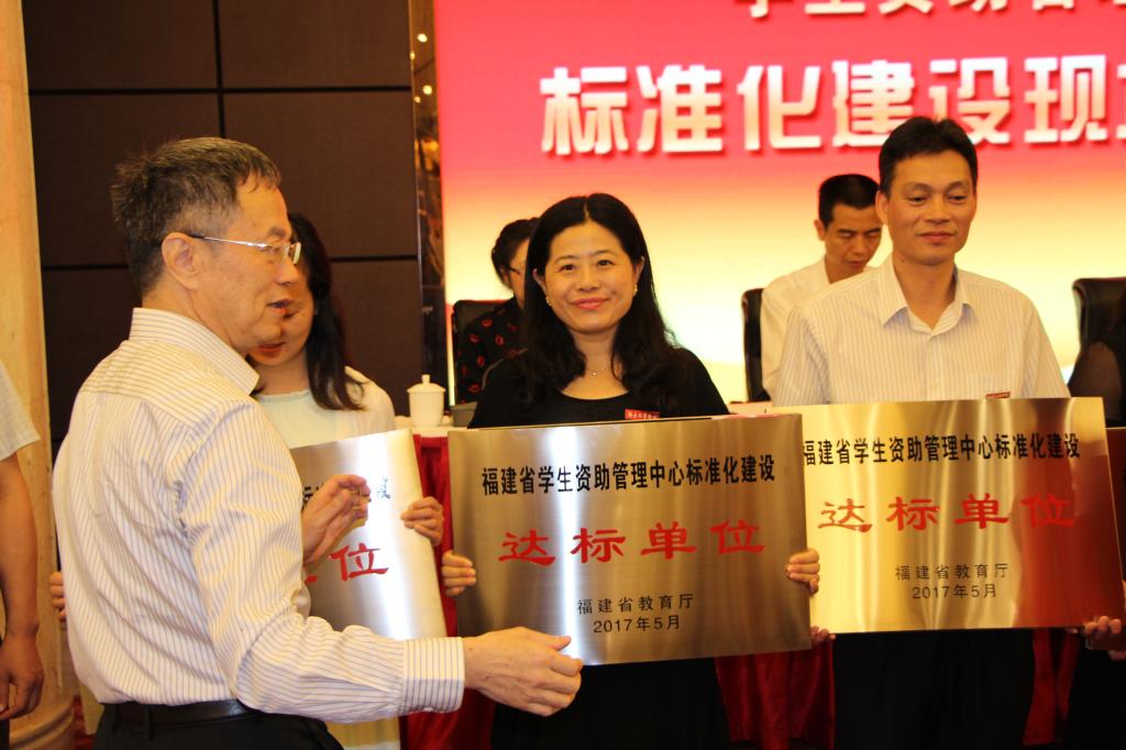 本网讯 2017年5月18日,福建省学生资助管理中心标准化建设现场推进会在三明永安召开,我院被省教育厅授予“第二批学生资助管理中心标准化建设达标单位”,本批次共有45个单位获此殊荣。省政协副主席、省教育厅副厅长薛卫民出席会议为达标单位授牌, 我院学生处李霞副处长参会并接受授牌。