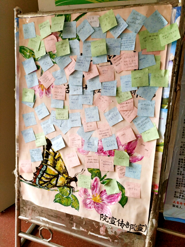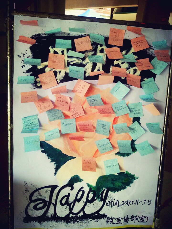 中午12:00,我院女生部和各系女生部分别在各宿舍楼大厅搭好了台子,并支起展板,向来往的同学发放传单来宣传活动。本次活动主要通过三种方式来呼吁同学们向母亲表达心意:一、在便利贴上写下对母亲的美好祝愿,贴在展板上,并将便利贴组成“母亲”字样以及桃心的形状;二、填写祝福母亲的贺卡,由女生部统一邮寄。短短一小时内,“许愿树”上密密麻麻贴满了对母亲感恩的满满深情。最后,所有参与活动的同学都可以在展板上签名留念。同学们对便利贴和贺卡的形式兴趣很高,活动受到了一致好评。