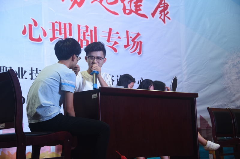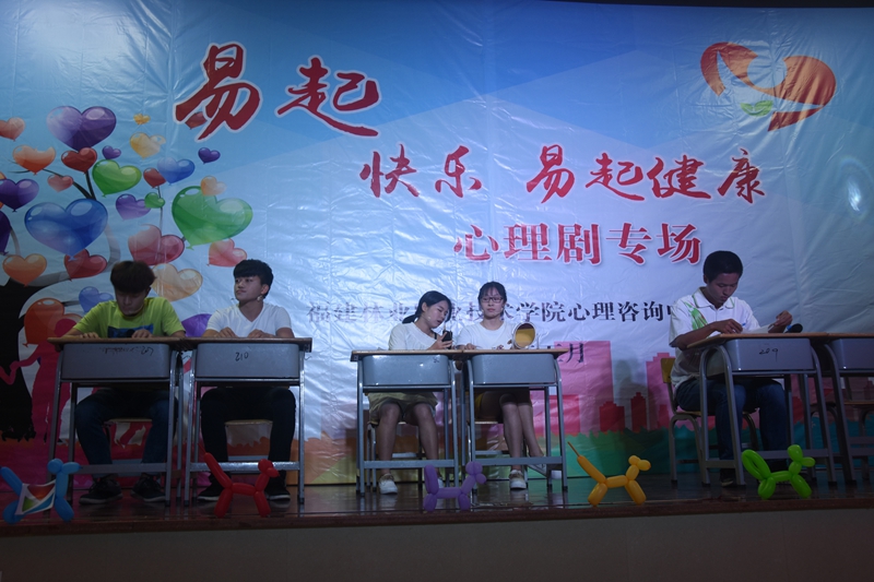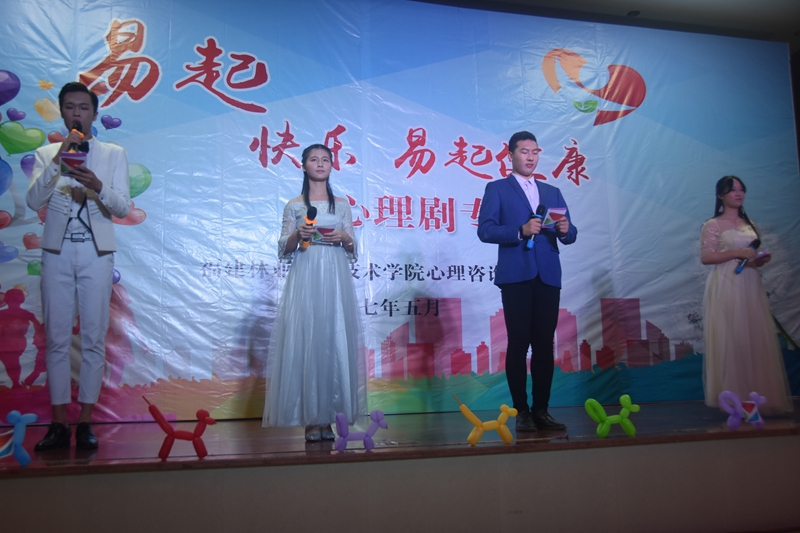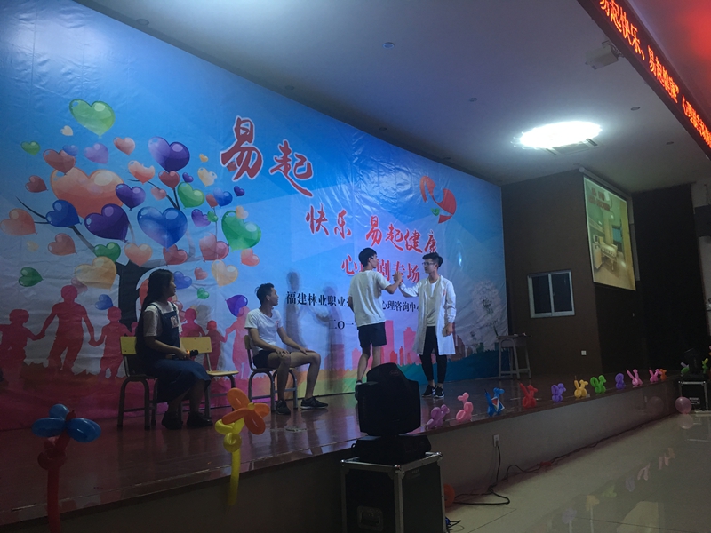5月26日晚,由学院心理咨询中心主办、院社团部心连新协会、易班发展中心学生工作站承办的5•25心理健康节“易起快乐•易起健康”心理剧表演在江南校区礼堂举行。艺术设计系党总支书记成榕老师、交通工程系党总支副书记徐洪老师、学生处心理咨询中心主任陈红英、各系辅导员、闽北职业技术学院心理老师张桂祥以及300多位观众到场观看了演出。