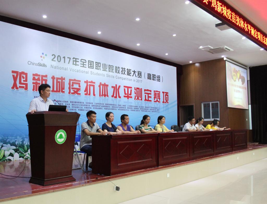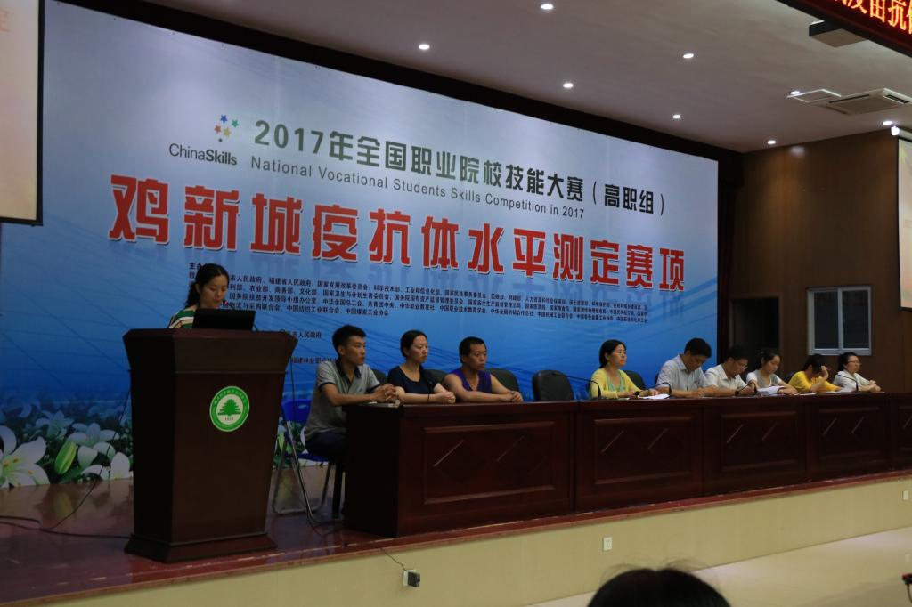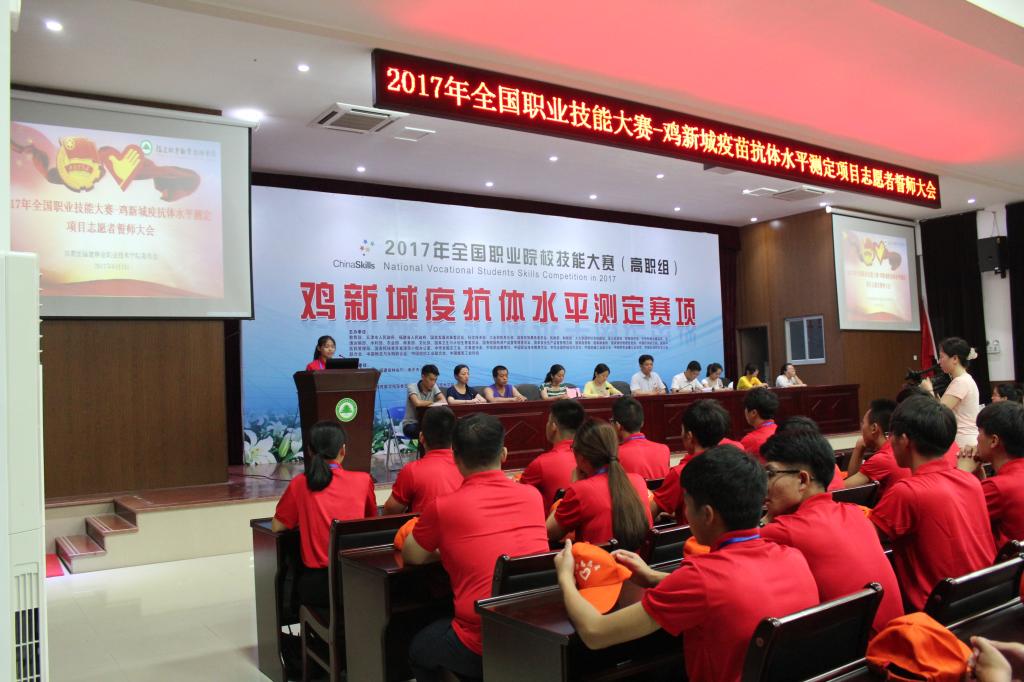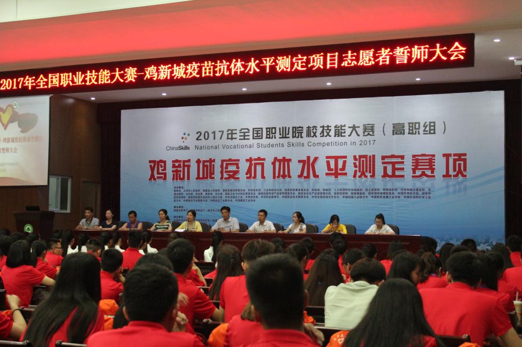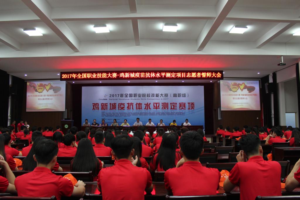 本网讯 为了提高2017年全国职业技能大赛-鸡新城疫苗抗体水平测定项目赛事期间志愿服务工作水平,全面践行“奉献,友爱,互助,进步”的志愿精神,我院于6月1日晚在江南校区礼堂召开2017年全国职业技能大赛-鸡新城疫苗抗体水平测定项目志愿者誓师大会。出席誓师大会的有学院党委副书记陈洪尧,学生处副处长李霞,林学系学生科科长钱叶会以及学生处、后勤处、团委、林学系、保卫科等相关老师。我院志愿者约300余人参加了此次誓师大会。大会由李霞老师主持。