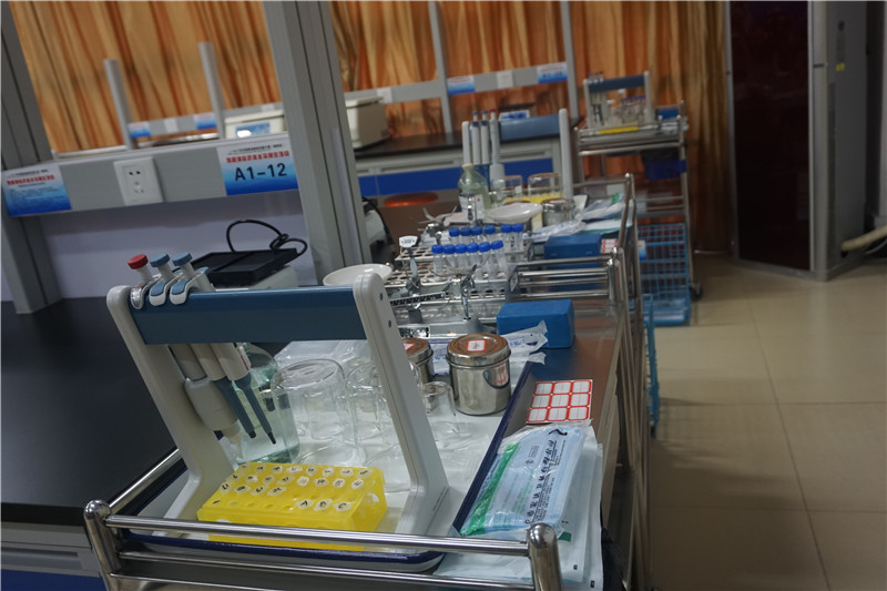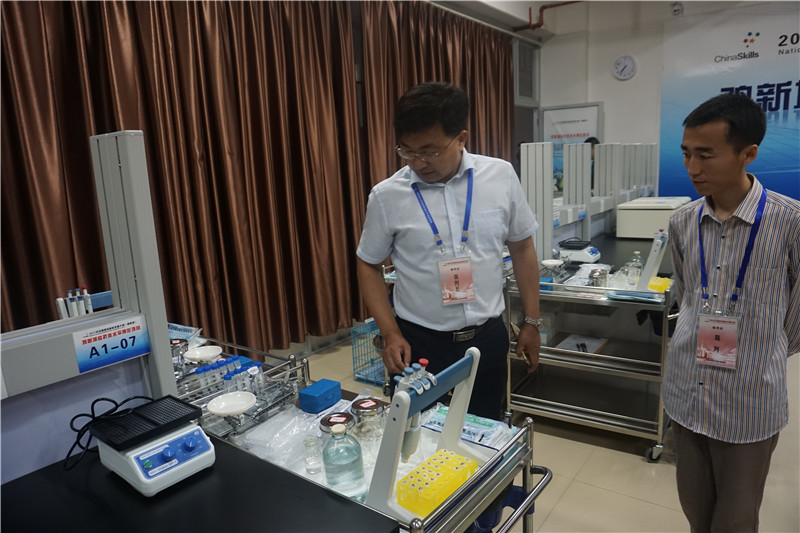 此次竞赛为团体赛,安排为上午、下午两场,每场比赛分为两个赛场,每组参赛选手为2名相互配合完成。经过严格的检录、抽签等环节,选手进入赛场以实验操作的方式开始了技能的比拼。在每个代表队两名选手的相互配合下,“鸡新城疫抗体水平测定”的实验步骤一一呈现在严格的裁判面前接受考验。