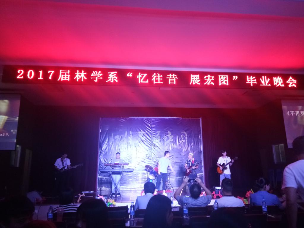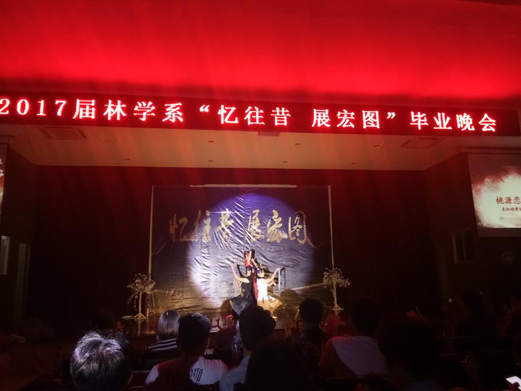 接着茶文化交流协会进行盖碗茶艺表演,古筝的悠长曼妙旋律与茶韵清香融合得惟妙惟肖,礼堂随处无不飘散着清香。爵士舞《SHAKEIT》、演艺社小品《太想爱你》、陈邓洁独唱《时间煮雨》以及花式调酒表演、未知动漫协会舞蹈表演《桃源恋歌》等节目将晚会推入高潮。整场晚会气氛跌宕起伏,晚会进行过程中插入播放教师毕业寄语视频和毕业生讲话环节,让在场的同学尤其是毕业生们不禁潸然泪下,感动不已。伴随着温馨的现场气氛,毕业生们也将对学弟学妹们的厚望传达。天下没有不散的筵席,最后声乐队的一首《相亲相爱》恰到好处的歌词表达了在场所有人此似此刻的心声。歌声响起,往事历历在目,在一片浓浓情谊与不舍中2017届林学系毕业生欢送晚会落下了帷幕。