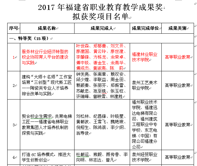 近日,福建省教育厅网站对2017年福建省职业教育教学成果奖拟获奖项目进行了公示,由我院叶世森、郑郁善等负责完成的《服务林业行业经济转型的校企协同育人平台的建设与实践》项目位列2017年福建省职业教育教学成果特等奖第一名。