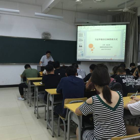 本网讯 9月8日,院党委书记徐志荣在江南校区实训四212教室,以“习近平教你五种思维方式”为题,给大学生上了一堂生动的思想政治理论课。徐书记运用马克思主义哲学基本原理,贯通古今,旁征博引,从习总书记高瞻远瞩的战略思维、以史为鉴的历史思维、蹄疾步稳的辩证思维、与时俱进的创新思维、防患未然的底线思维等五个维度,阐述了习近平总书记治国理政新理念新思想新战略。既有对理论、理念的系统深入解析,又有具体的思路方法可供参照。通过徐书记哲学理性思辨、纵横空间维度、跨越历史事实演绎引人入胜的讲授,使同学们获得思维上的冲击,赢得了阵阵的掌声。