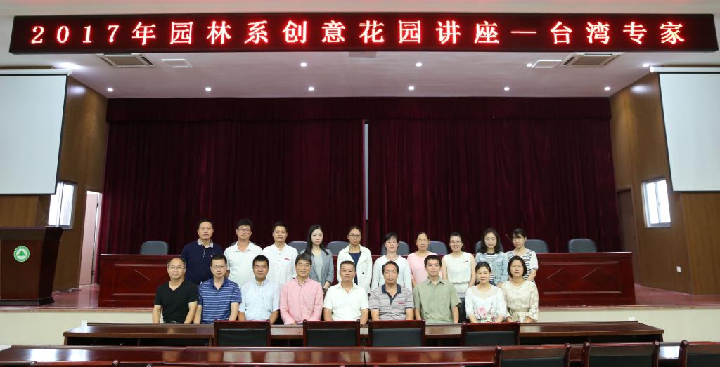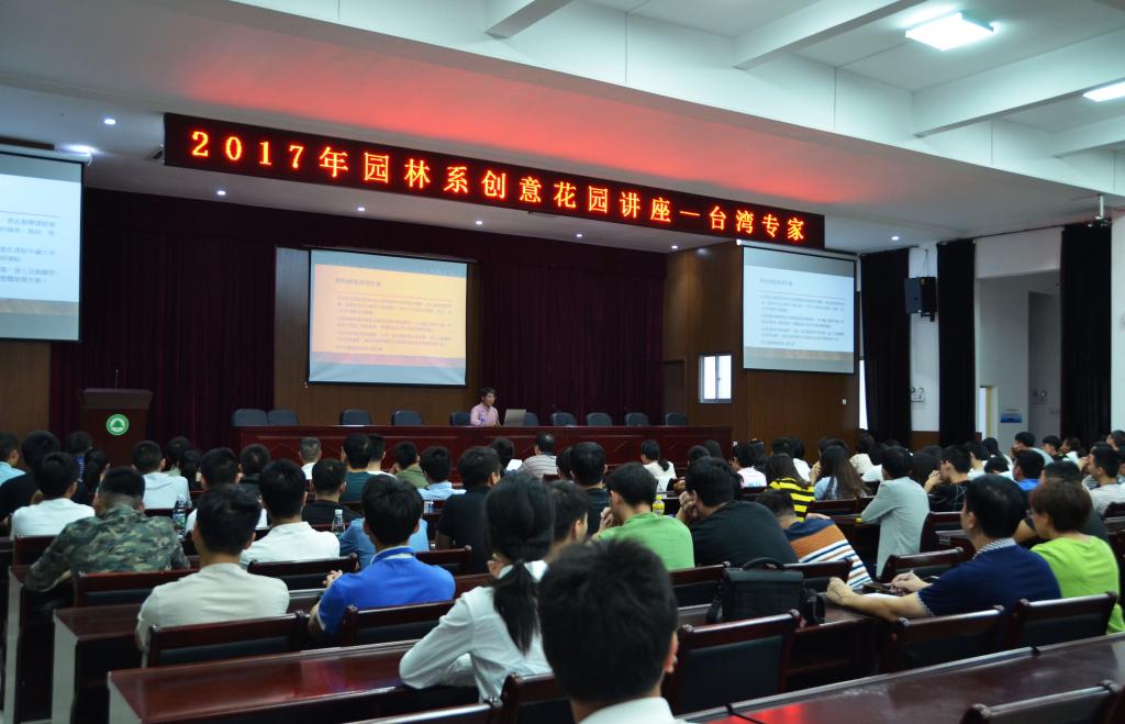 本网讯 为提高园林系学生创意思想、设计水平、实践能力和协同创新精神,提高我院园林类毕业生实践能力和专业技能水平,持续提升园林系专业教学水平,园林系于本学期开展“创意花园”竞赛活动。2017年10月14日,园林系邀请了台湾造园景观技能竞赛认证鉴评师曹明利老师和游象君老师,在江南校区礼堂做了两场精彩纷呈的“创意花园”讲座。中华海峡两岸园艺交流协会理事长周张徳堂和福建农林大学台湾籍黄老师、张老师莅临讲座现场,园林系全体专兼职教师,以及园林系百名应届毕业生参加了讲座。讲座由园林系主任黄勤坚主持。