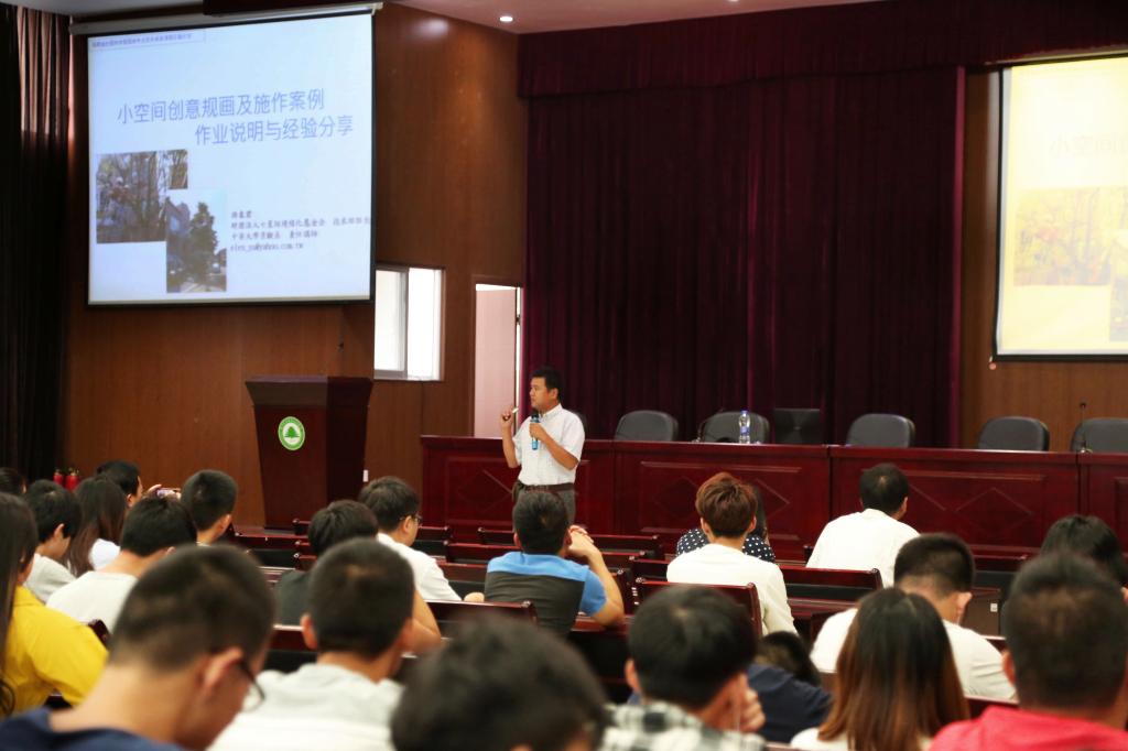 “创意花园”竞赛分前期讲座介绍交流、中期设计方案评图和基地勘察准备、最终基地实操三个阶段进行。本次讲座介绍了“创意花园”竞赛的内容及要求,通过实例展示台湾的“创意花园”作品和制作过程,归纳总结“创意花园”的设计理念、设计要点、制作手法等,讲座旁征博引,给予现场师生以极大的启发。
