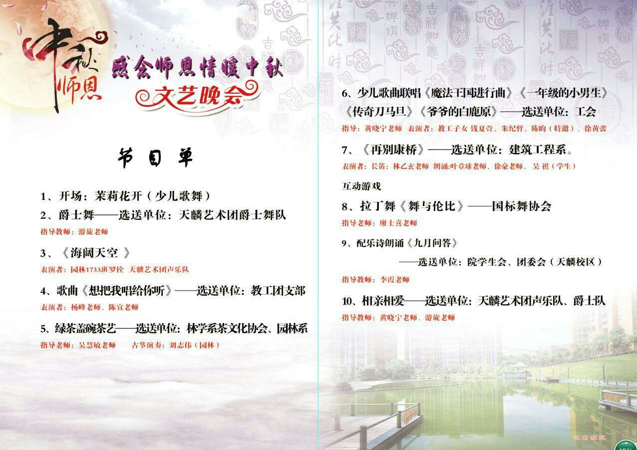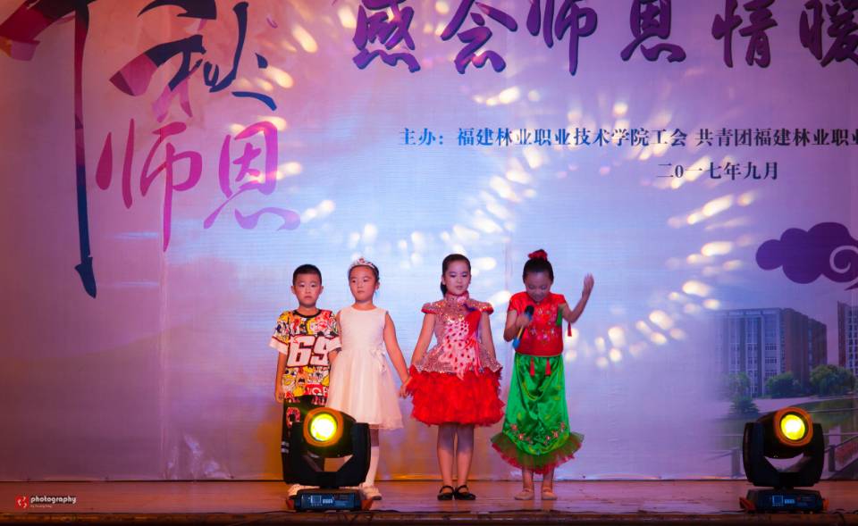 接下来,学院天麟艺术团舞蹈队的同学们为我们带来了靓丽青春、优美动人的爵士舞表演,激昂的音乐、灵动的舞步、欢快的节奏、热烈的掌声,瞬间就点燃了现场的激情。2017级新同学——园林1733班罗铨与天麟艺术团声乐队的学长们为我们带来的一曲激情的《海阔天空》,向大家展现了生机与活力的现代大学生朝气蓬勃的面貌;青年教工团支部的杨峰老师和陈宜老师带来的深情意长的歌曲《想把我唱给你听》,用歌声诉说着对学院全体老师及来自五湖四海的同学们的深情;当园林系刘志伟袅袅的古筝演奏声淡淡的划过舞台,林学系茶文化协会的绿茶盖碗茶艺表演带领我们品味茶中人生百味;学院部分教师孩子钱夏萱、朱纪哲等也来到晚会现场,为我们带来俏皮灵动的少儿歌曲联唱《魔法王国进行曲》《一年级的小男生》《北京茶馆》《爷爷的白鹿原》;在建筑工程系林乙玄老师悠扬的长笛声中,我们跟随叶章球老师追寻着徐志摩的足迹,一起感受《再别康桥》如梦如幻的诗情画意;廖士喜老师与他所带国标舞协会的同学们带来的拉丁舞表演,《舞与伦比》更是把晚会推向高潮;天麟校区院团委会带来的配乐诗朗诵《九月问答》,一问一答之间,浓缩了师生之间深深的情谊,一声声问答感念浩浩师恩、浓浓师情……最后,晚会在天麟艺术团满载祝福的歌曲《相亲相爱》的歌声中,炫彩落幕。