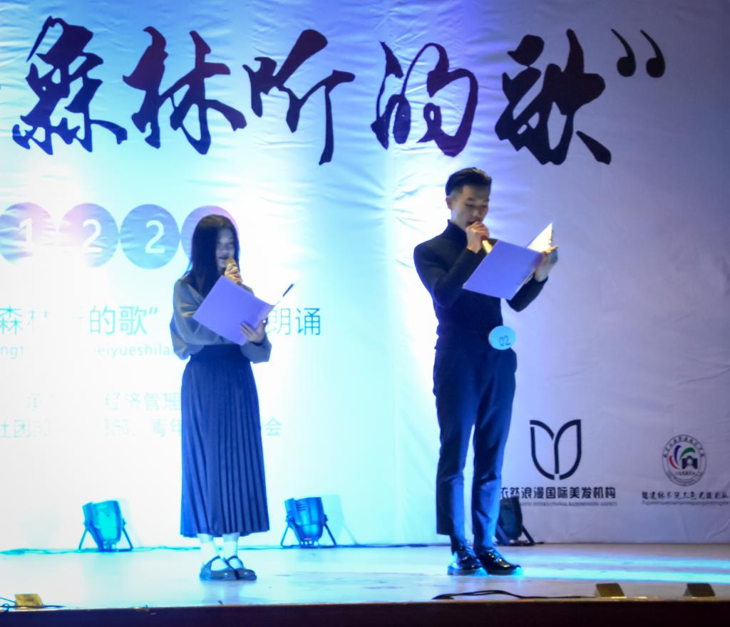 方寸舞台,尽显真我风采。活动在《快乐男孩》的舞蹈中拉开序幕,比赛中各位参赛选手们各显其能,声情并茂地演绎了《沁园春雪•我爱这土地》、《雪夜林畔驻马》、《青春·中国》、《我的中国》、《南方的夜》等经典诗文,有的讴歌光辉事迹,有的赞颂崇高精神,……他们自然亲切、抑扬顿挫、激昂慷慨、婉约动人的朗诵打动了评委老师和现场观众,为大家呈现了一台充满爱国情怀、传承森林文化的视觉盛宴。经过激烈的角逐,最后由柯敏等同学朗诵的《沁园春雪•我爱这土地》荣获了本次决赛一等奖。