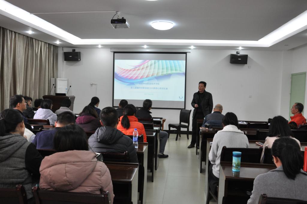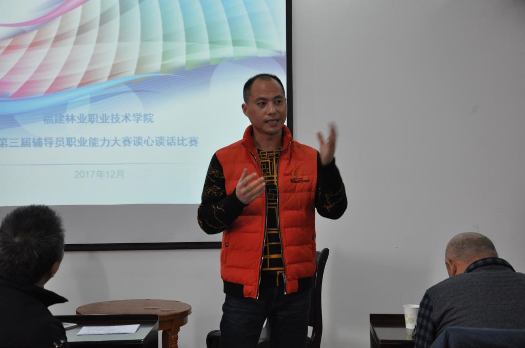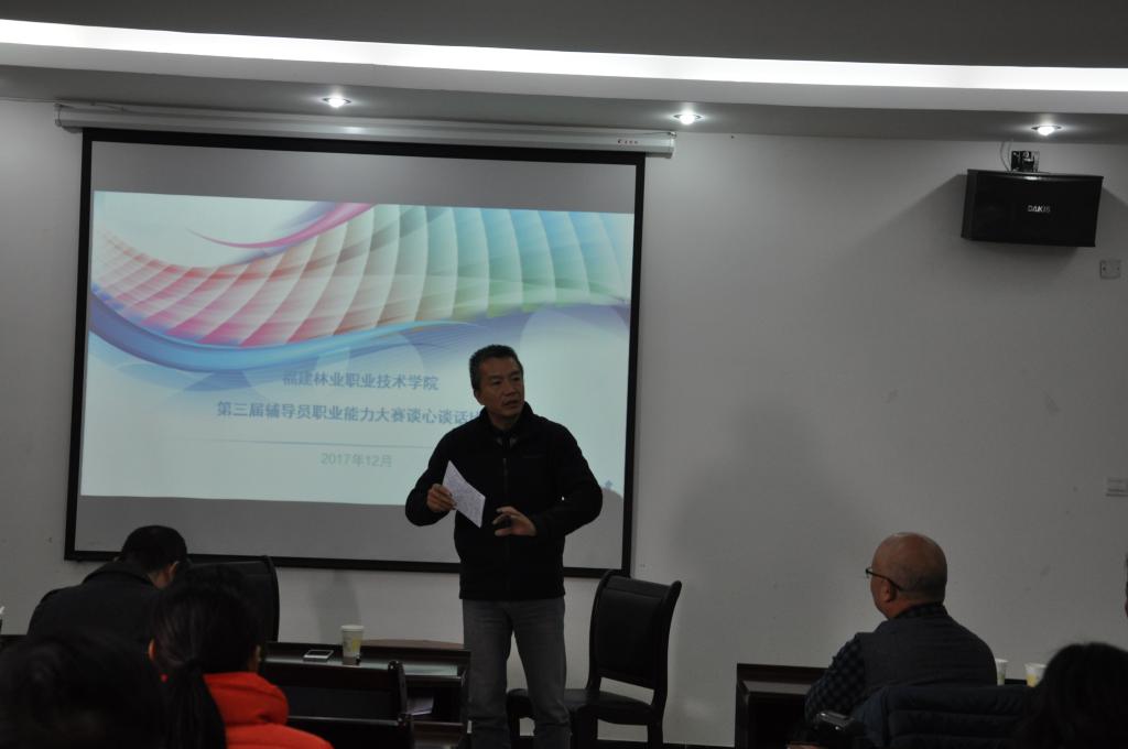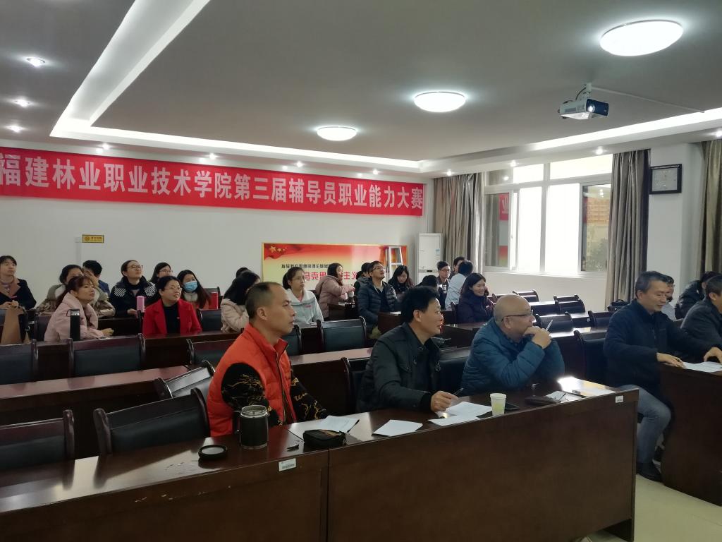 本网讯 12月29日上午,学生处组织开展的第三届辅导员职业能力大赛“谈心谈话技巧”赛项在江南校区举行。学生处副处长李霞、艺术设计系党总支书记成榕、林学系党总支书记吴奇镇、建筑工程系党总支书记王云彪、自动化工程系党总支副书记范有福、园林系党总支副书记陈剑勇到场观看比赛并担任评委,全院专职辅导员参加了本次大赛,青年教工团支部杨峰老师担任主持人。