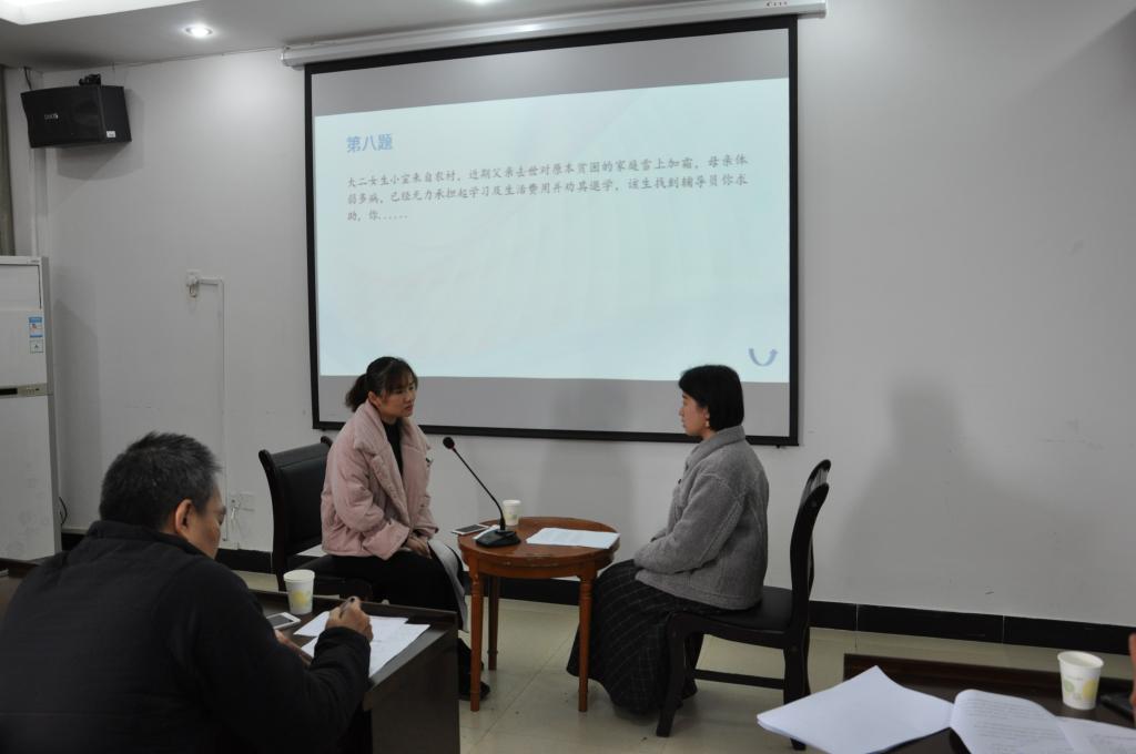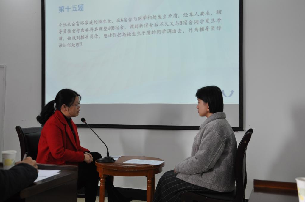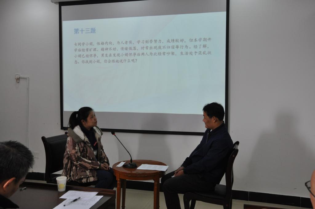 此次谈心谈话考题涉及面广,类型丰富,主要围绕学生日常学习生活中经常出现的各种困扰提出问题,全面考察了辅导员对相关政策、校纪校规、学生特点、学生成长成才规律的了解把握及对学生的教育引导能力,旨在考察辅导员运用专业知识、交流技巧等辅导员工作技能帮助学生解决学习、生活中遇到的各类问题。在比赛现场,辅导员与学生进行情景模拟谈话,针对学生遇到的转专业、失恋、宿舍人际关系紧张等问题展开了谈心,各位辅导员们沉着应对参演学生的各类刁难,表现冷静且到位。