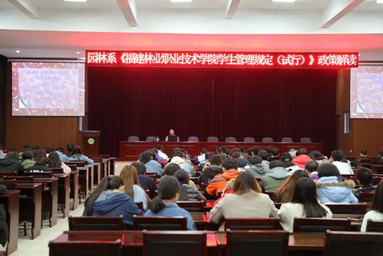 本网讯 为贯彻落实教育部第41号令《普通高等学校学生管理规定》文件精神及教育部有关工作要求,及时反映中央新精神新理念新要求,学院于2017年12月出台了新版的《福建林业职业技术学院学生管理规定(试行)》。为方便学生第一时间熟悉、掌握学院的学生管理规定,园林系学工组于2018年1月3日晚上七点在江南校区礼堂召开《福建林业职业技术学院学生管理规定(试行)》政策解读讲座。此次讲座由园林系学工组组长陈剑勇老师主讲,园林系所有专兼职辅导员、全体在校生参加,讲座共分二场进行。