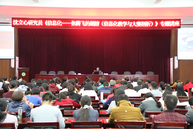 讲座中,沈立心研究员围绕信息化技术对传统课堂教学从融合到创新主题,讲解了信息化教学的目的意义和发展趋势,并以信息化大赛获奖作品为案例进行了深入的剖析,和教师们分享了信息化教学课件的制作经验、重点难点及解决方法。讲座重点突出,内容针对性强,语言通俗精炼、案例剖析深入浅出,教师们听后受益匪浅。