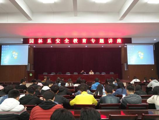 本网讯 为了加强学生的安全意识,增强同学们的自律自制能力,2018年3月26日晚上,园林系在江南礼堂举办安全教育专题讲座。讲座由夏道派出所周剑斌警官主讲,保卫科科长胡宗焕老师主持,园林系党总支副书记陈剑勇、辅导员吴锦鸿和孙钰及园林系全体学生听取了此次讲座。
