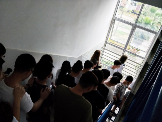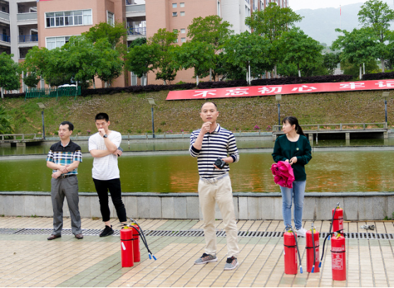 为确保演练活动万无一失,我系提前制定了演练活动方案,内容包括演练安排、演练准备、演练要求、组织机构、演练程序及其他相关要求,并由各位辅导员老师召开动员班会,组织本班学生认真交流学习,做好充分细致的演练培训指导工作。下午,虽然天公不作美,但豆大的雨滴却并未浇熄同学们对本次演练活动的热情。15点50分,全体学生准时到达指定教室集结待命,16点整,随着几声急促的哨响,疏散演练正式开始,教室里的同学冷静快速地从各个教室冲出,来到最近的安全出口,排着队紧张有序地下楼梯,并飞奔向指定区域。在人工湖广场,院保卫科科长胡宗焕老师现场为同学们普及了一些必备的消防安全知识,介绍灭火器的使用方法,并由保卫科老师们为大家演示如何正确使用灭火器。随后,在胡宗焕老师的教授和带领下,辅导员孙钰老师、吴锦鸿老师及在场的学生自愿者亲身体验了一把灭火器的使用及灭火过程,灼烧的火焰、滚滚的浓烟和袭人的热浪深深地震撼了在场的每一位同学。
