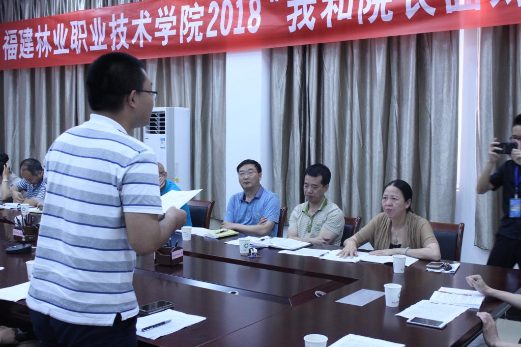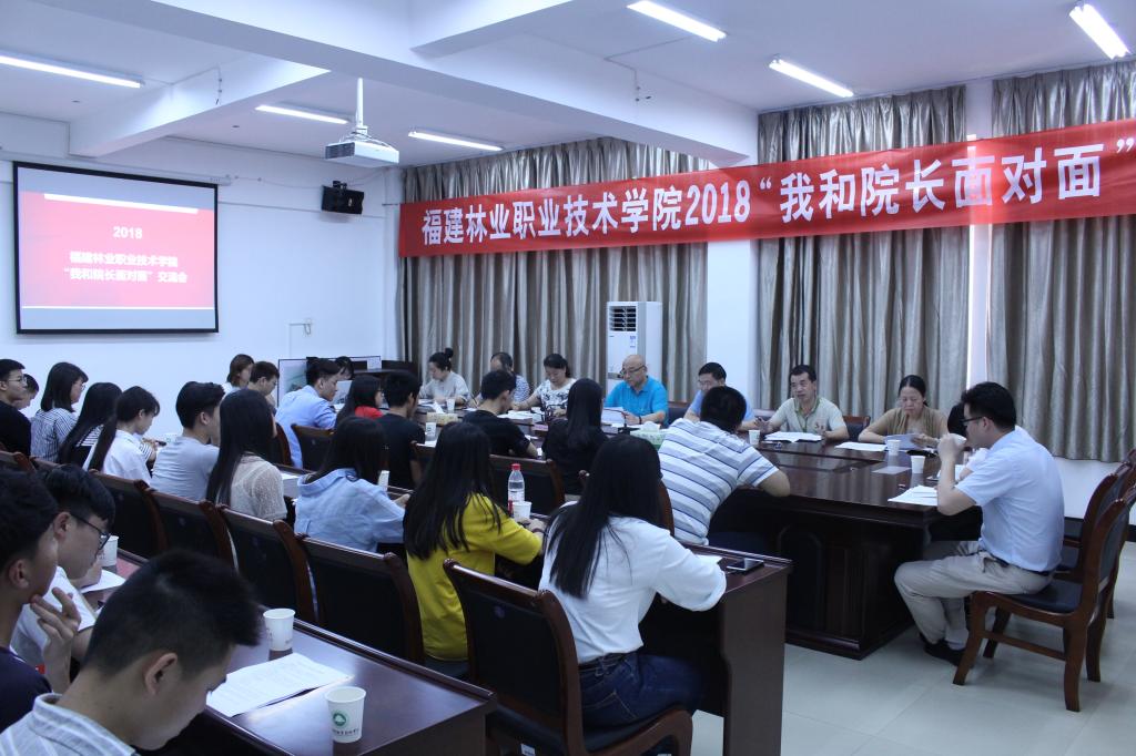 本网讯 为推进现代化大学制度建设,增强学生参与学院民主管理工作的实效性、创新性,引领青年学生投入到学院的发展建设中,构建科学、规范、创新的管理体系,2018年5月8日下午2时40分,学院在江南校区办公楼第一会议室举办2018年福建林业职业技术学院“我和院长面对面”交流会。