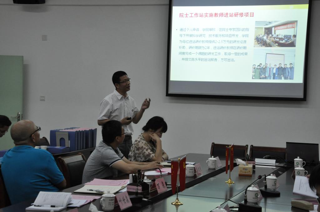 会上,杨勇组长表明此行目的是为了学院申报2018年省示范性院士专家工作站而来。接着,万泉院长对杨勇组长等一行人员莅临学院考察表示欢迎,希望考察组不吝赐教,给予指导与支持。叶世森副院长针对学院院士专家工作站建设历程、成果进行了深刻、全面的阐述说明。