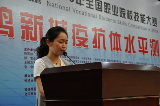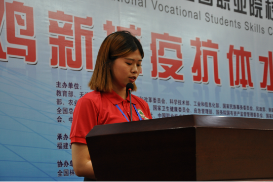志愿者代表方紫钧同学代表我院全体志愿者发表讲话。她郑重承诺:志愿者们将会端正态度,提高认识,积极参加志愿者培训,以热情、温馨、优质的服务理念,积极向上、饱满的工作热情,迎接全国各地的参赛者和来宾,在服务中学习、在体验中成长与收获!