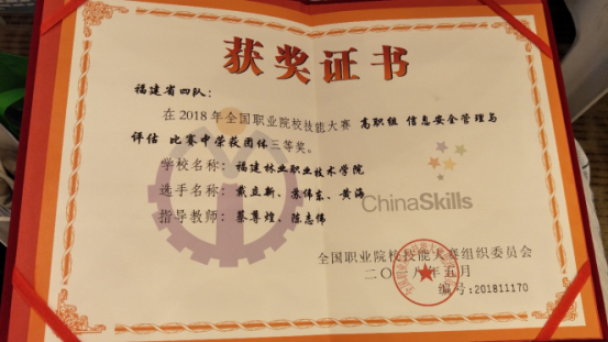 本网讯 2018年5月29日,自动化工程系学生在蔡尊煌、陈志伟两位老师的率领下参加2018年全国职业院校技能大赛高职组“信息安全管理与评估”赛项,斩获三等奖。