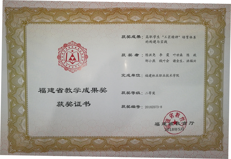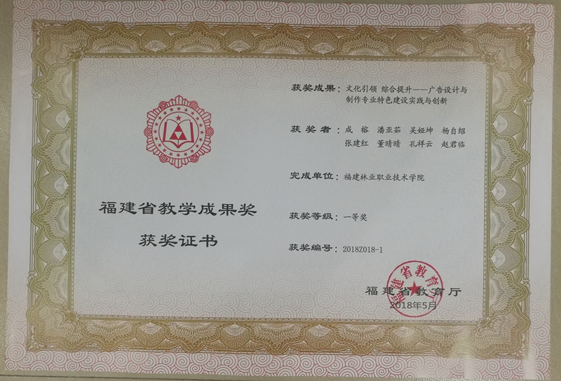 本网讯 近日,福建省教育厅发放了2018年教学成果奖证书,我院喜获3项省级教学成果奖。其中,成榕副教授领衔完成的《文化引领,综合提升--广告设计与制作专业特色建设实践与创新》获省级教学成果一等奖;陈洪尧副研究员主持完成的《高职学生“工匠精神”培育体系的构建与实践》、谢金生教授主持完成的《制造类专业“二元制”技术技能人才培养模式改革与实践》获省级教学成果二等奖。