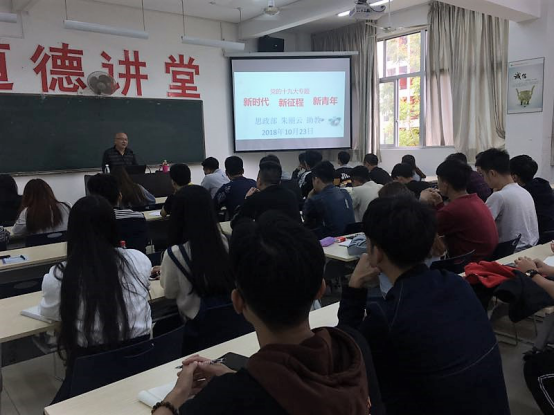 本网讯 为了进一步学习贯彻党的十九大精神,2018年10月23日下午,建筑工程系学生党支部在江南校区实训四210教室组织开展了“党的十九大专题——新时代 新征程 新青年”专题讲座。讲座由系党总支书记王云彪老师主持,学院思政部朱丽云老师主讲,建筑工程系近百名学生党员和入党积极分子参加了学习。