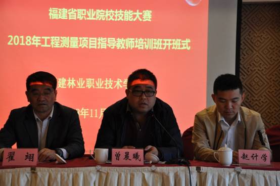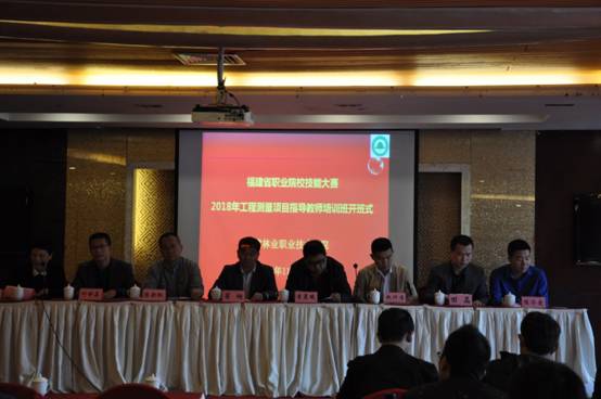 本网讯 11月2日上午,2019年福建省职业院校技能大赛《工程测量》赛项指导教师培训班在闽北大饭店举行。自然资源部所属国家测绘地理信息局职业技能鉴定指导中心处长、全国测绘地理信息职业教育教学指导委员会秘书长曾晨曦、解放军工程大学教授、2018年全国职业技能大赛工程测量赛项裁判长翟翊、福建省职教中心办公室主任陈新枫、国赛合作企业科力达公司总监田品、校企合作企业金创利公司总经理陈济爱、福建林业职业技术学院副院长、教授叶世森及各高职院校工程测量项目指导老师共40余人出席开班仪式,开班式由福建林业职业技术学院实训中心主任裘晓雯教授主持。