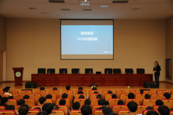宣讲会伊始,现场气氛良好,秩序井然。三家公司依次上台播放公司的宣传视频作为开场,三位招聘负责人通过ppt演讲,向毕业生介绍了公司概况、发展历程、晋升通道、配套福利等情况,让毕业生们对三家公司有了更全面的了解,使他们在投递简历时多了一份理性,少了一份盲目。其中福耀玻璃招聘代表曾美金以最近超高人气的选秀综艺节目《偶像练习生》和《创造101》为例子,表明好的平台至关重要,品牌力量牵动世界。奥弗微科信息科技有限公司陈代表说,公司加班是常态,所以要求员工能吃苦,并在后期还会安排考核。最后出场的厦门建霖工业有限公司始创于1976年台湾,董事长吕理镇的理念是公司想要发展就要多走多跑,所以给公司取了一个英文名字“RUNNER”。三位公司负责人精彩宣讲迎来全场掌声雷动。