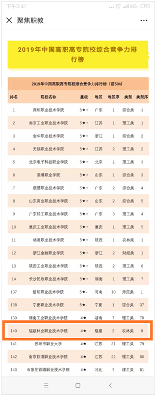 据悉,2019年3月27日-29日,第二届全国高职高专院校“优质校”建设与评价论坛在江苏常州举行,会上正式发布了金平果2019年中国高职高专院校竞争力排行榜,我院名列福建省第3名,全国第140名。